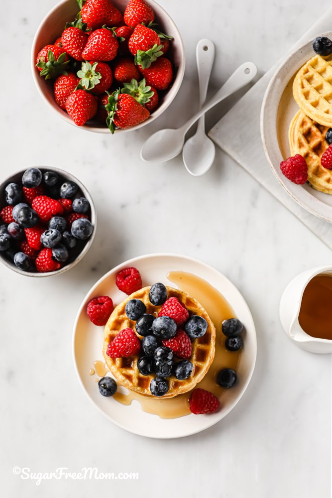 Though they are made with cheese, these crisp up after cooking them in your waffle iron and are amazing topped with sugar free maple syrup and butter!