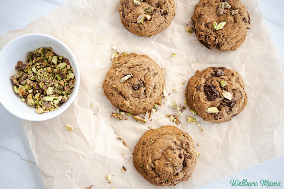 Dark chocolate chunks offer a bittersweet bite in every mouthful and add some healthy polyphenol antioxidants, magnesium, and micronutrients. They’re made with sea salt which offers electrolytes and a nice contrast to the sweet cookie. And the pistachio pieces are just the icing on top. They’re also salty but give it such a unique flavor.