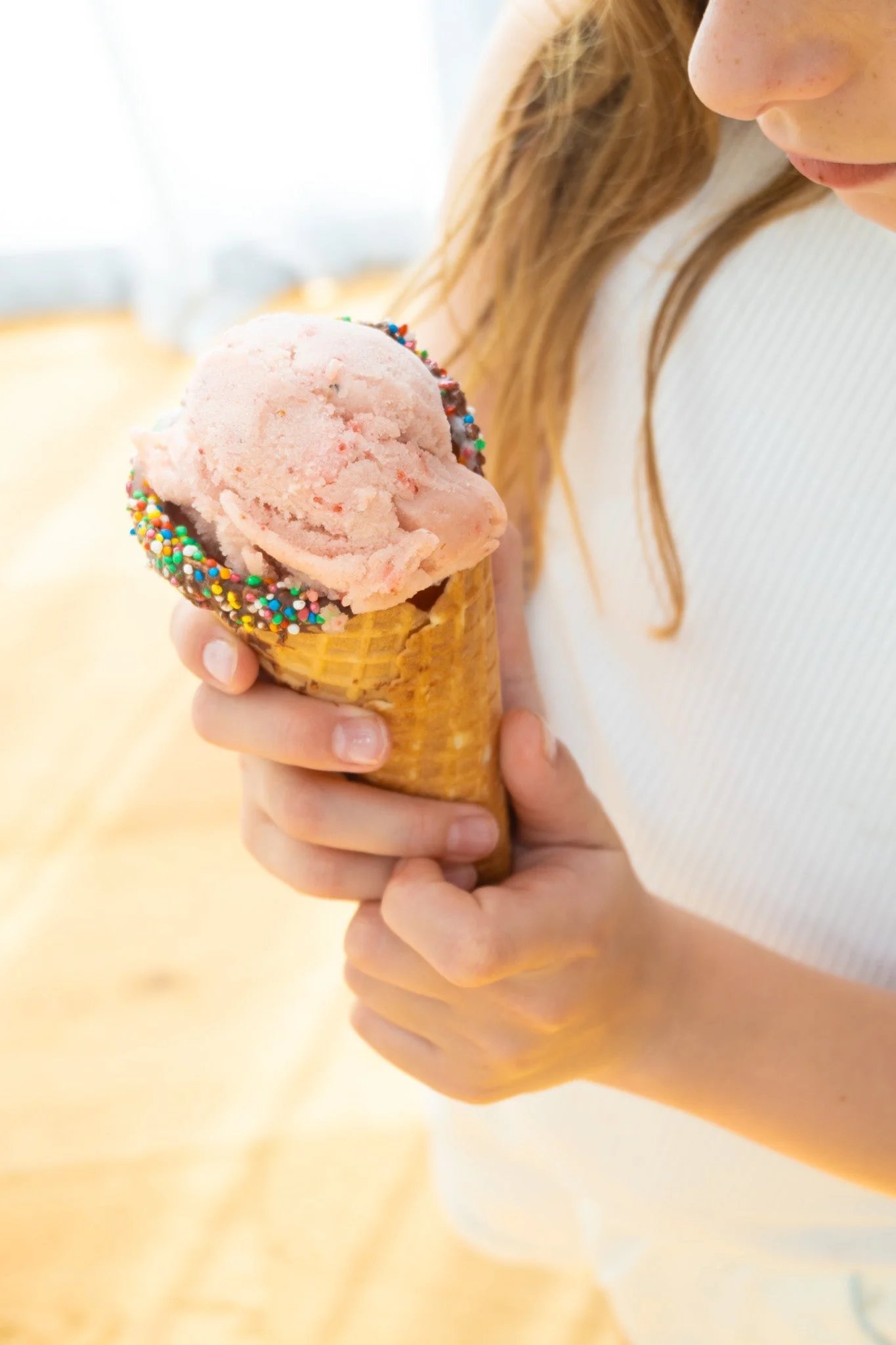 For fun- decorate some waffle cones by dipping into melted chocolate then into a bowl of sprinkles. Sit in a cup to set while you’re making the fruit whip.