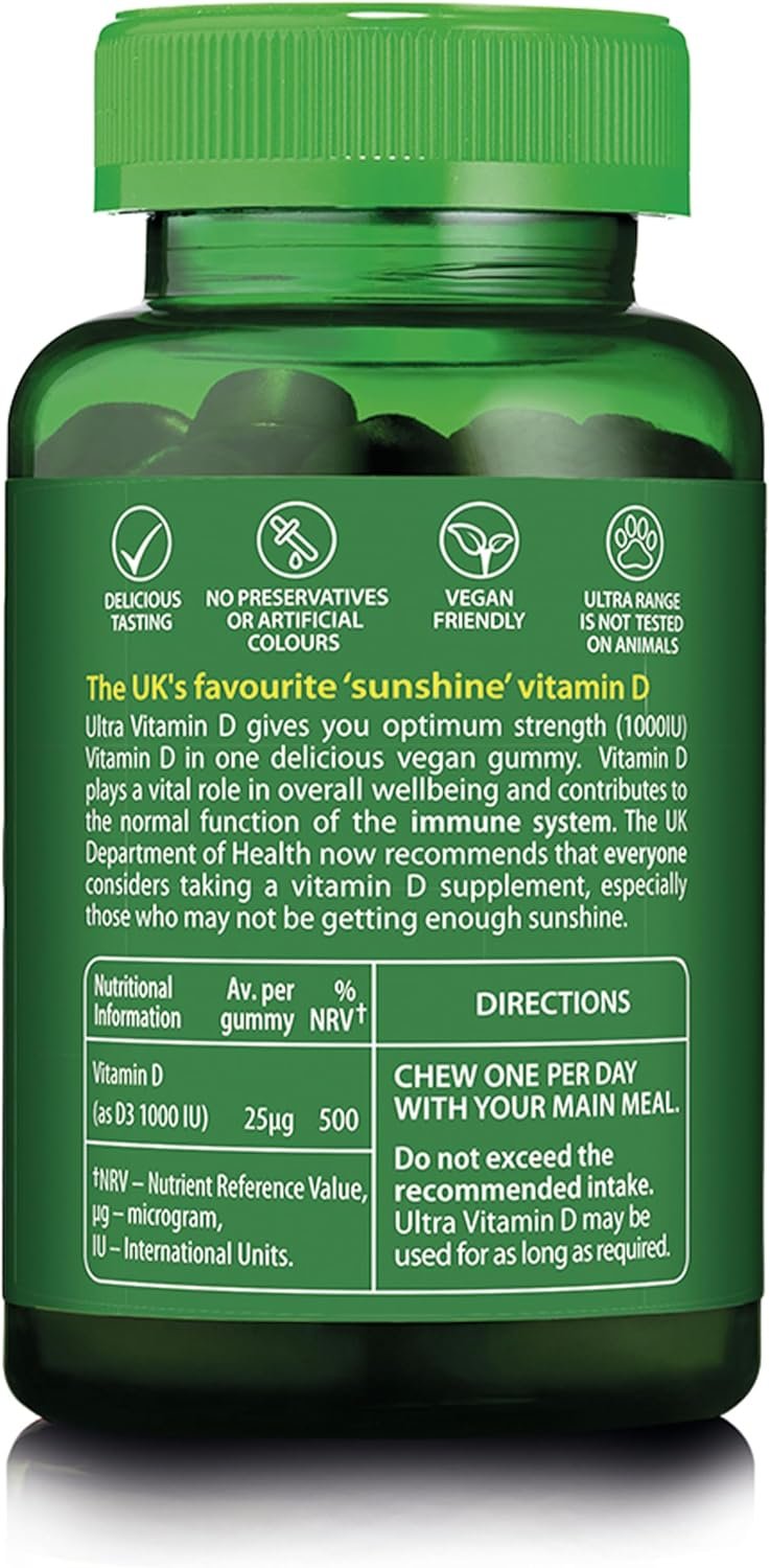 Ultra Vitamin D gummies, provides 1000IU vitamin D, an optimum strength of vitamin D, in one yummy vegan gummy